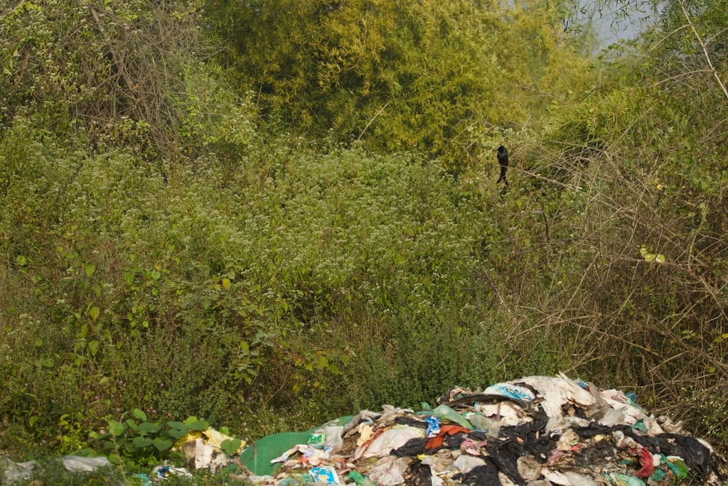 A Black Drongo perched on a twig. Beneath a pile of garbage thrown. This unfortunately is a common sight at this lake.