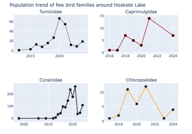 Above graph describes trend of Insectivorous found in the lake from various periods. The families in the top row are Button quails, Nightjars and in the second families are Rollers and Leaf birds. On the x-axis, you can see the years and on the y-axis, the number represents the count of the birds during this period.